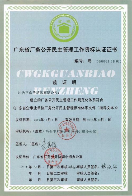 廠務公開明主管理工作貫標認證證書