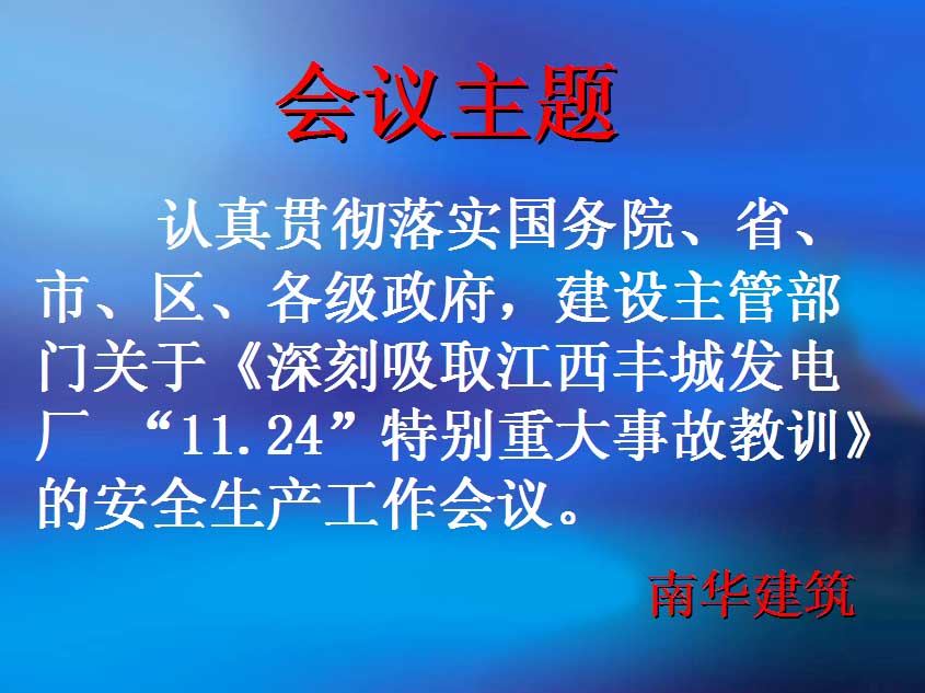 11月29日,公司組織公司職員、在建項目部負責(zé)人以及相關(guān)人員在公司會議廳召開安全生產(chǎn)緊急會議,認真貫徹落實國務(wù)院、省、市、區(qū)、各級政府安全生產(chǎn)工作緊急視頻會議精神、建設(shè)主管部門關(guān)于《深刻吸取江西豐城發(fā)電廠“11.24”特別重大事故教訓(xùn)》文件精神。會議上,公司部門負責(zé)人對承建的在建項目的安全及進度情況進行匯報,分析工程施工上需嚴格加強防范的各個重大危險源,指導(dǎo)安全生產(chǎn)技術(shù)措施,提出具體安全安排措施,要求各項目按照以下要求切實抓好公司安全生產(chǎn)工作: