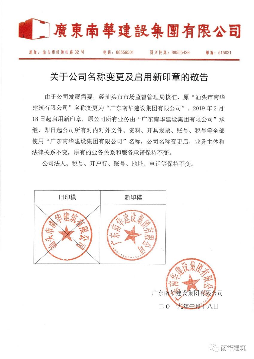 為實現(xiàn)公司戰(zhàn)略目標(biāo),滿足公司規(guī)模化發(fā)展要求,經(jīng)市場監(jiān)督管理部門核準(zhǔn),“汕頭市南華建筑有限公司”更名為“