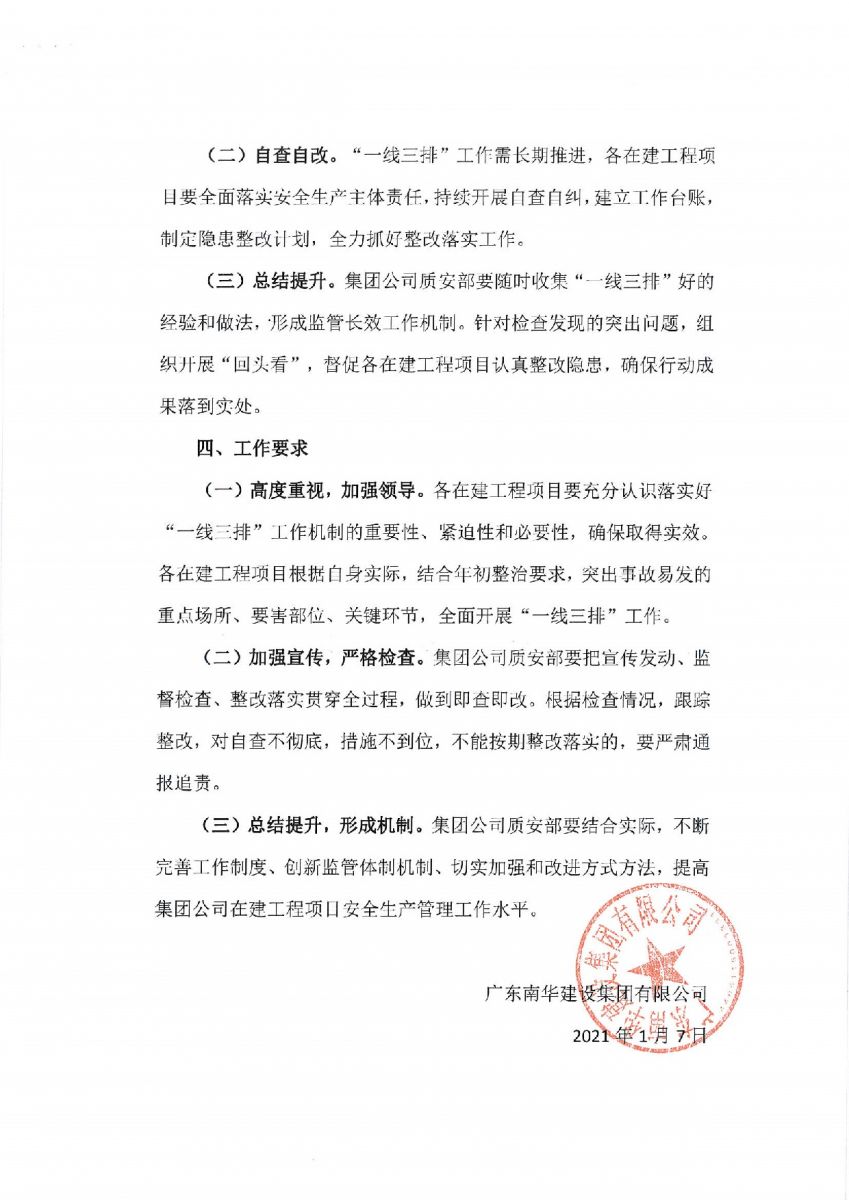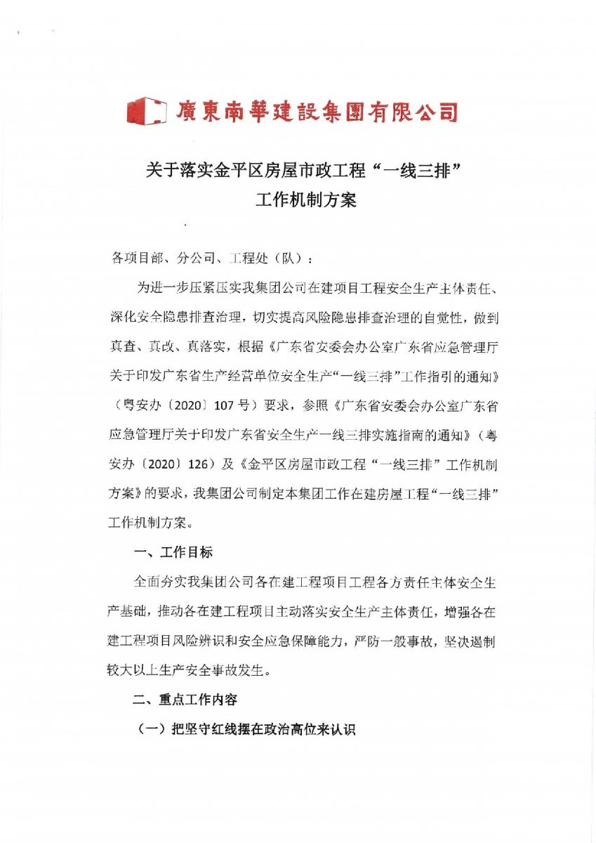 廣東南華建設集團有限公司關于落實金平區(qū)房屋市政工程“一線三排”工作機制方案