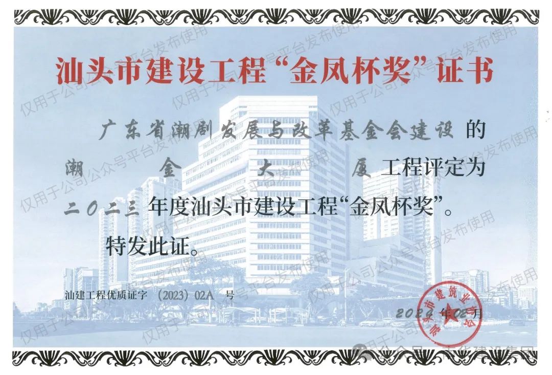 近日,由廣東省潮劇發(fā)展與改革基金會(huì)興建,廣東南華建設(shè)集團(tuán)有限公司投資并承建的潮金大廈榮獲“汕頭市建設(shè)工程金鳳杯獎(jiǎng)“。“金鳳杯獎(jiǎng)”是由汕頭市頒發(fā)的優(yōu)質(zhì)工程獎(jiǎng)項(xiàng),由汕頭市建筑業(yè)協(xié)會(huì)組織評(píng)選,旨在表彰建筑質(zhì)量、工程管理、技術(shù)創(chuàng)新等方面表現(xiàn)突出的工程項(xiàng)目。