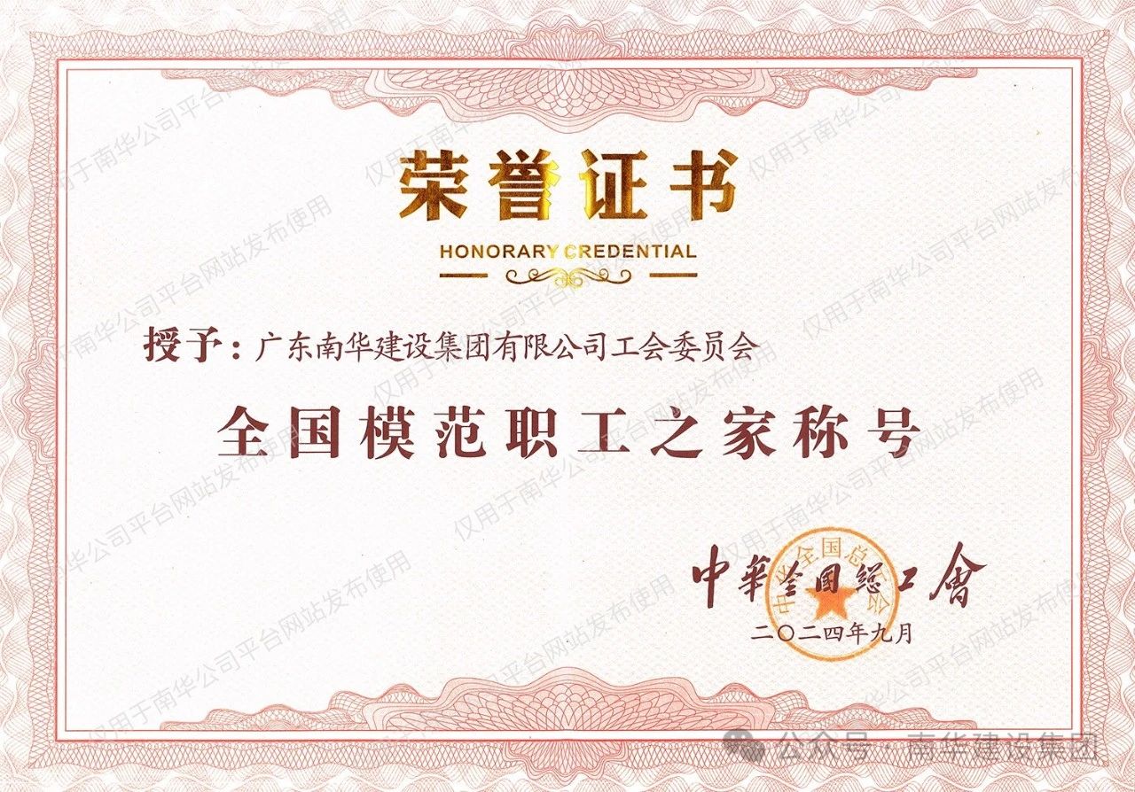 近期,中華全國總工會表彰了一批全國模范職工之家、模范職工小家和全國優(yōu)秀工會工作者,廣東南華建設(shè)集團有限公司工會委員會榮獲“全國模范職工之家”稱號。