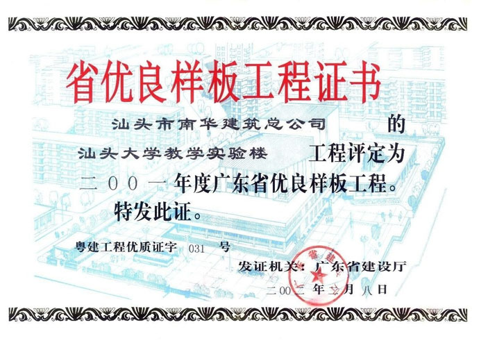 汕頭大學(xué)教學(xué)實(shí)驗(yàn)樓 省優(yōu)良證書