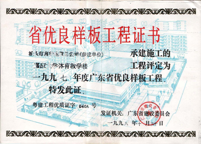 嘉應(yīng)大學(xué)體育教學(xué)樓 省優(yōu)良證書