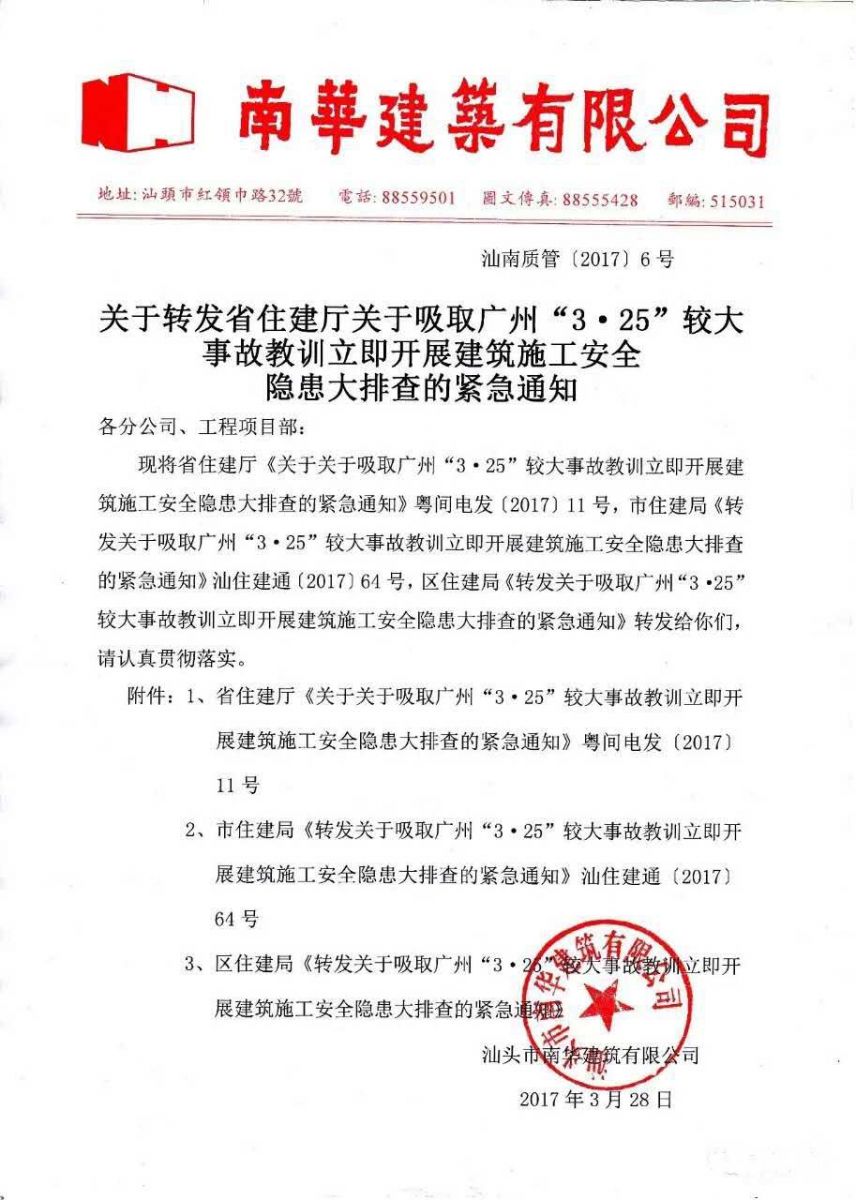 3月28日,公司組織公司職員、在建項(xiàng)目部負(fù)責(zé)人以及相關(guān)人員召開安全生產(chǎn)緊急會(huì)議,認(rèn)真貫徹落實(shí)省、市、區(qū)、各級(jí)政府安全生產(chǎn)工作緊急會(huì)議精神、建設(shè)主管部門關(guān)于《吸取廣州“3.25”較大事故教訓(xùn)立即開展建筑施工安全隱患大排查的緊急通知》文件精神。會(huì)議上,公司部門負(fù)責(zé)人對(duì)承建的在建項(xiàng)目的安全及進(jìn)度情況進(jìn)行匯報(bào),分析工程施工上需嚴(yán)格加強(qiáng)防范的各個(gè)重大危險(xiǎn)源,指導(dǎo)安全生產(chǎn)技術(shù)措施,提出具體安全安排措施,本次檢查按照文件要求進(jìn)行了建筑施工安全隱患大排查,也再次對(duì)文件精神進(jìn)行傳達(dá)貫徹,要求各項(xiàng)目按照以下要求切實(shí)抓好公司安全生產(chǎn)工作: