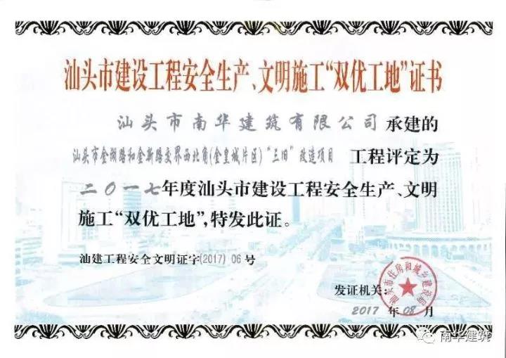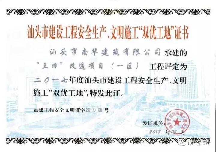 “三舊”改造項(xiàng)目(一區(qū))和汕頭市金湖路和金新路交界西北角(金皇城片區(qū))“三舊”改造項(xiàng)目順利通過(guò)驗(yàn)收,并于8月份榮獲汕頭市建設(shè)工程安全生產(chǎn)、文明施工“雙優(yōu)工地”證書,這也是對(duì)公司在安全文明生產(chǎn)管理上的一種認(rèn)可及鞭策。