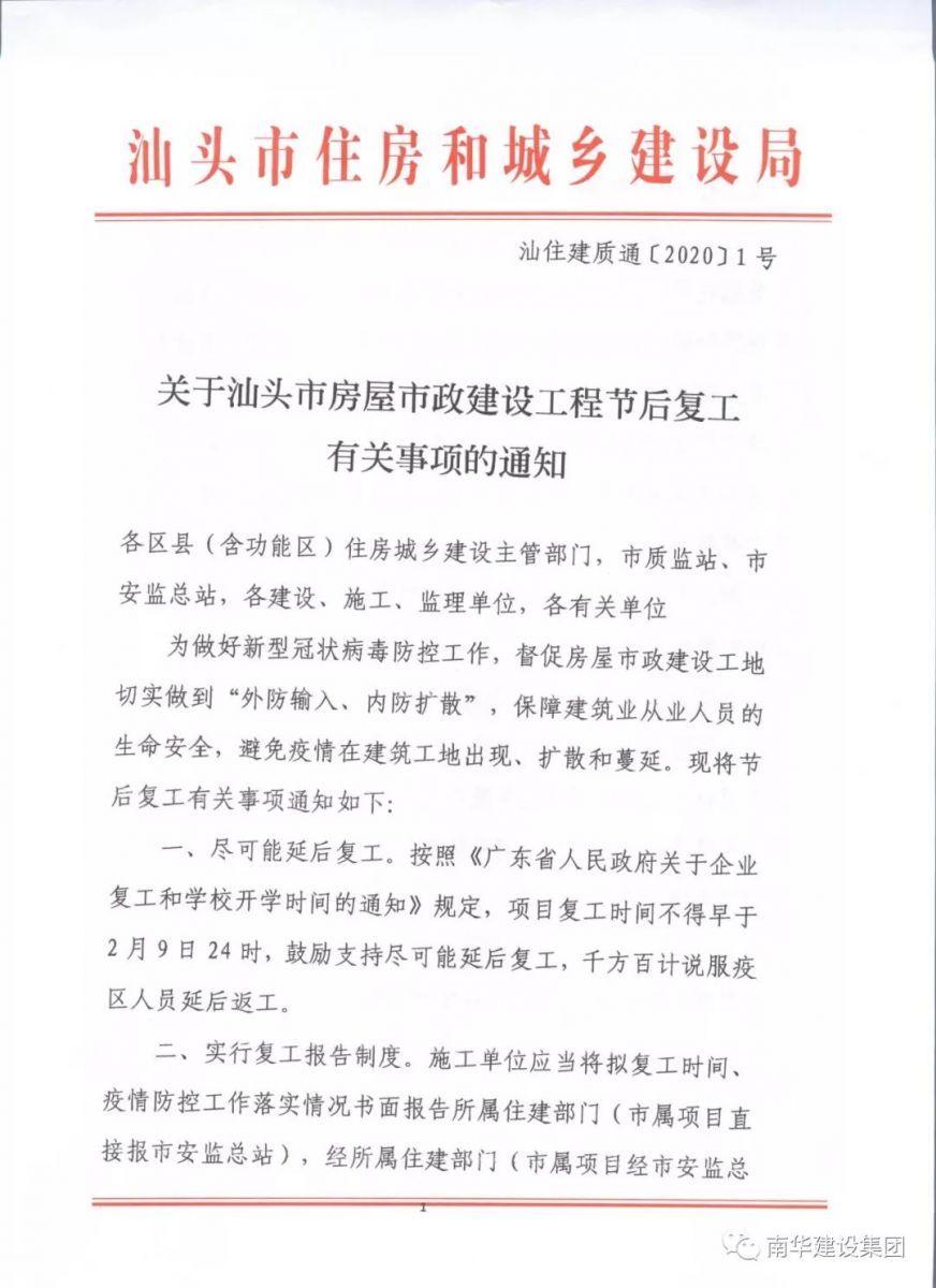 關(guān)于汕頭市房屋市政建設(shè)工程節(jié)后復(fù)工有關(guān)事項的通知